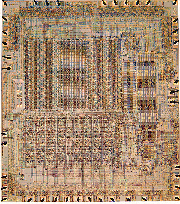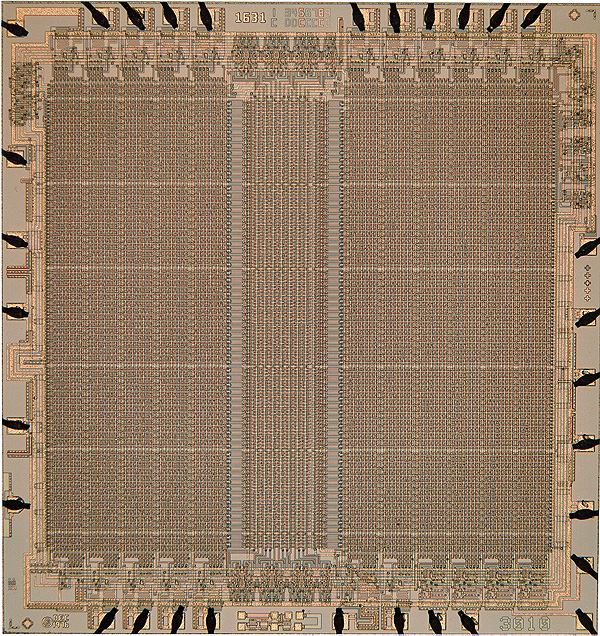 The LSI-11 consisted of three chips, one of which could be replicated: the microcode ROM (MICROM, up to three supported), the Control chip, and the Data chip. It was implemented in Western Digital's 7u NMOS process and operated at 3.3Mhz (300ns microcycle). Internally, the Data chip was an 8b microprocessor, double pumping the data path to execute the PDP-11 16b instructions.